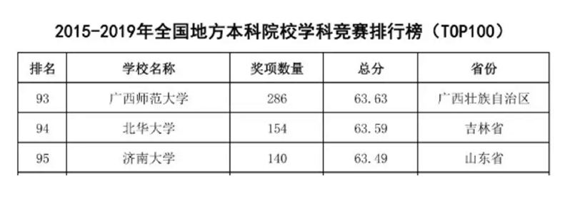 我校在2015-2019年全国地方本科院校学科竞赛排行榜中位列93名