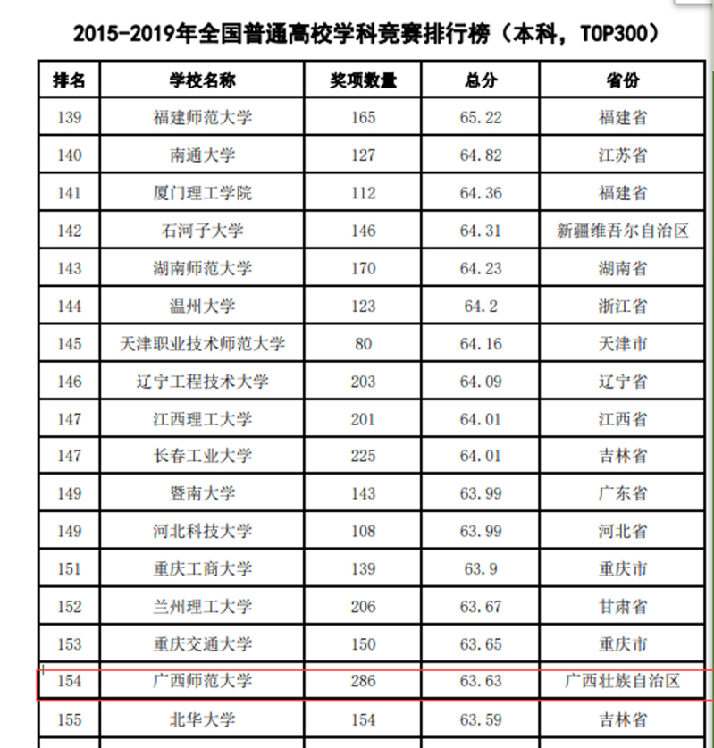 我校在2015-2019年全国普通高校学科竞赛排行榜(top300)中位列154名