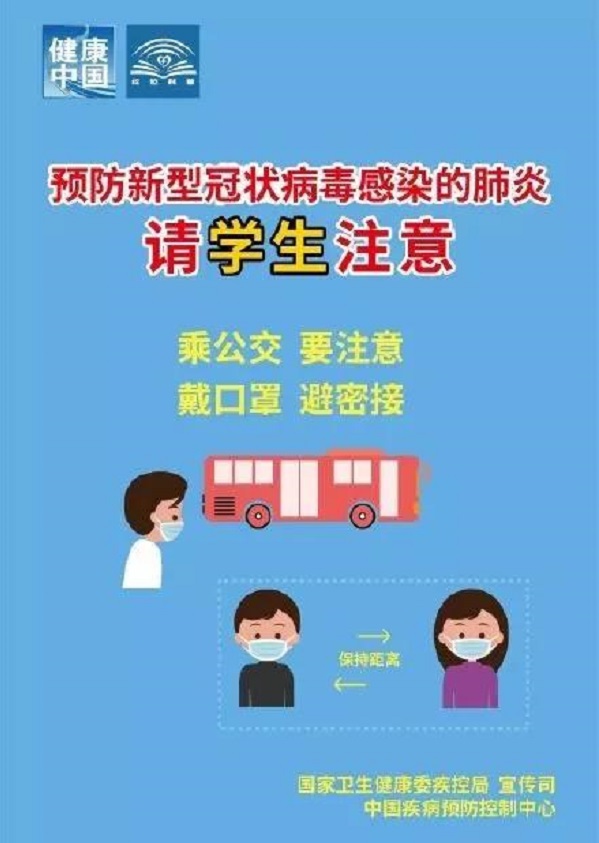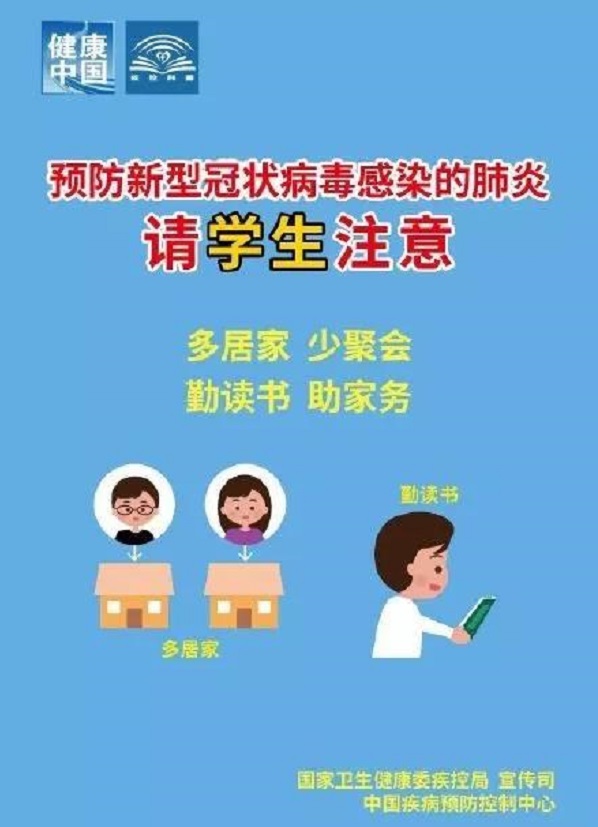 一、请同学们及时关注并自觉遵守学校发布的相关规定和通告要求。积极关注官方机构(如:国家卫生健康委、中国日报等)发布的新型冠状病毒感染的肺炎防控有关内容,了解疫情相关信息,学习健康防病知识,提高自我防护能力。请同学们正确对待新型冠状病毒感染的肺炎疫情,认识到疫病可防可控。不造谣、不信谣、不传谣,不在网络上发布未经证实的相关信息。