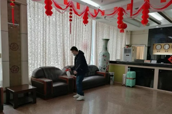 Staff from the International Education and Exchange Center disinfected public areas in and out of the dormitory.