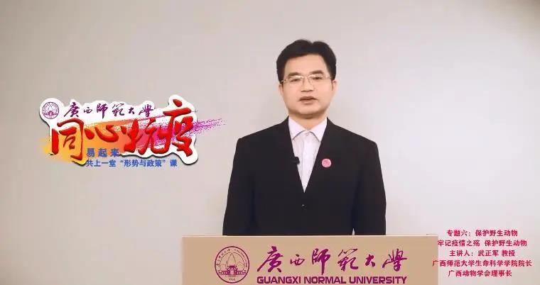 汤志华教授的课程以《全民战“疫”,中国制度优势集结强大战力》为题,讲述了疫情防控期间,我们坚持党的集中统一领导,进一步发挥制度优势,把制度优势转化为治理效能,凝聚战胜疫情最大合力的的必要性。武正军教授以《牢记疫情之殇,保护野生动物》为题,生动的讲述了从我做起,保护野生动物,保护地球家园的重要性。