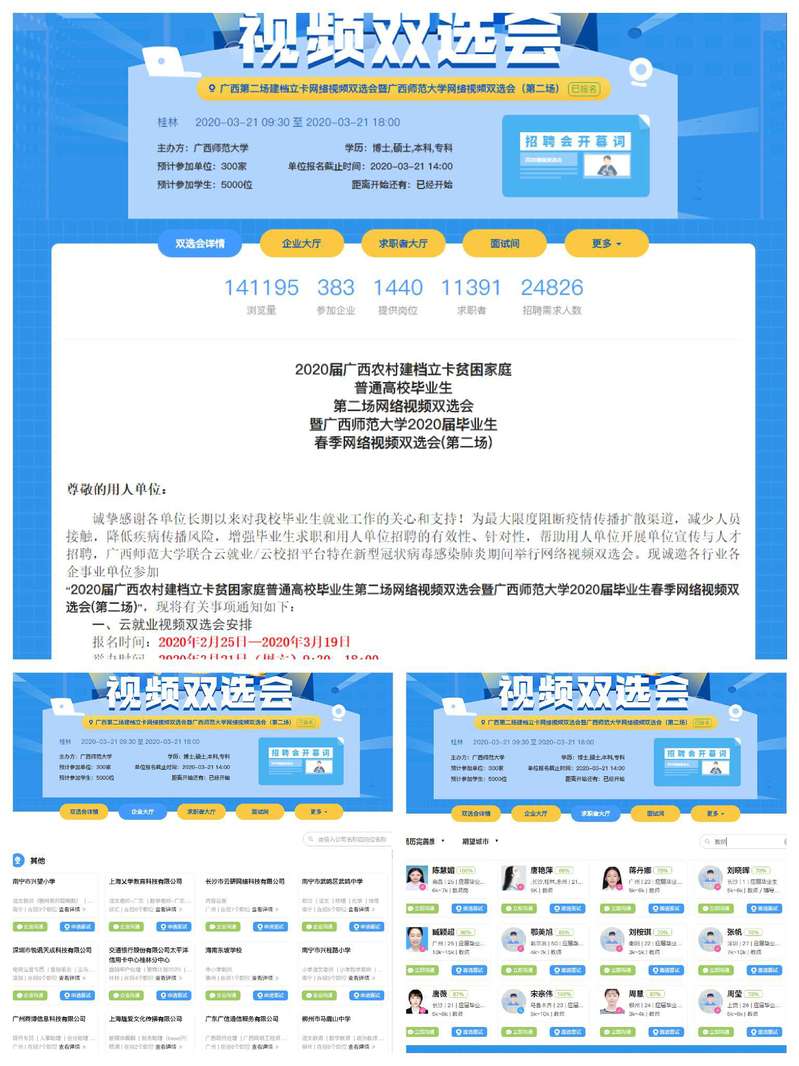为进一步贯彻落实党中央、国务院关于促进高校毕业生就业工作的决策部署,减少疫情对毕业生就业工作的影响,促进农村贫困家庭普通高校毕业生就业,做好就业帮扶工作,3月21日,由自治区教育厅主办、我校承办的“2020届广西农村建档立卡贫困家庭普通高校毕业生第二场网络视频双选会”圆满结束,这也是我校2020届毕业生春季第二场网络视频双选会。双选会上,我校700多未就业建档立卡毕业生全员参与,非建档立卡毕业生2300多人参加。