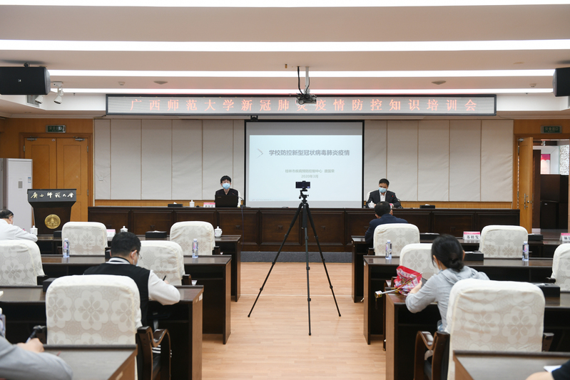 本次培训会邀请了桂林市疾病预防控制中心副主任唐国荣主讲,唐国荣结合自身工作经验,解读了目前桂林市、自治区疫情防控形势与相关政策规定,他围绕构建疫情防控工作体系、隔离医学观察、个人防护以及开学前工作要求等方面,对学校如何科学规范做好疫情防控工作进行了全面细致地分析与讲解。培训会上,唐主任以互动方式回答参会人员的提问,解答了关于师生隔离防控等相关工作疑惑。