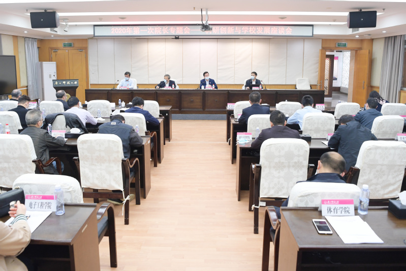 3月26日下午,我校在育才校区图书馆一楼会议室召开2020年第一次院长专题会研讨科研创新与学校发展。校长贺祖斌、副校长黄文韬、苏桂发、孙杰远、林春逸出席会议,科技处、社科处、人事处、教务处、研究生院、校团委等职能部门负责人以及各学院(部)院(部)长、分管科研工作副院(部)长、教师代表等70余人参加会议。会议由苏桂发主持。