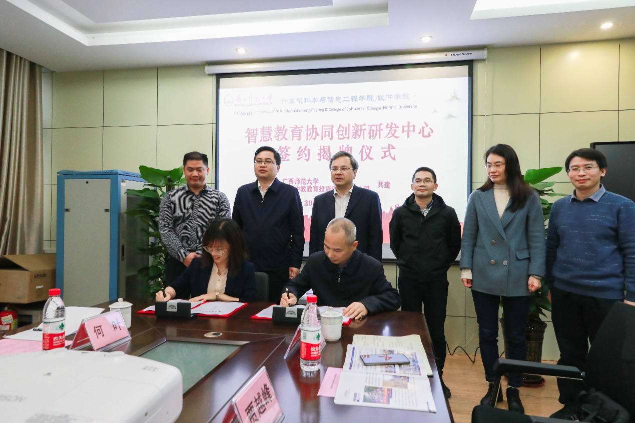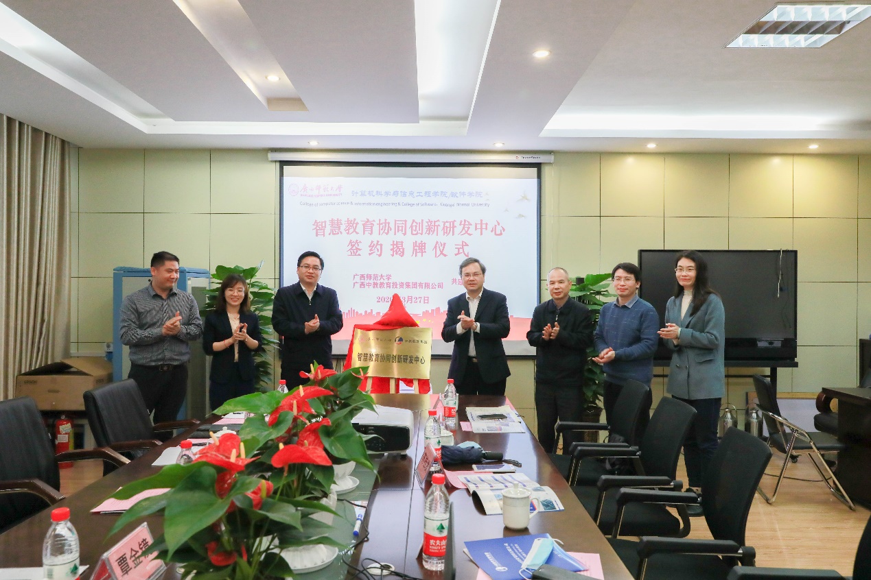 3月27日,由广西中教教育投资集团有限公司与广西师范大学联合共建的“智慧教育协同创新研发中心”正式设立。签约及揭牌仪式在我校育才校区举行。广西中教教育投资集团有限公司董事长刘君及其团队,我校副校长苏桂发,广西人工智能学会、我校教育学部、科技处、计信学院相关负责人参加了签约及揭牌仪式。