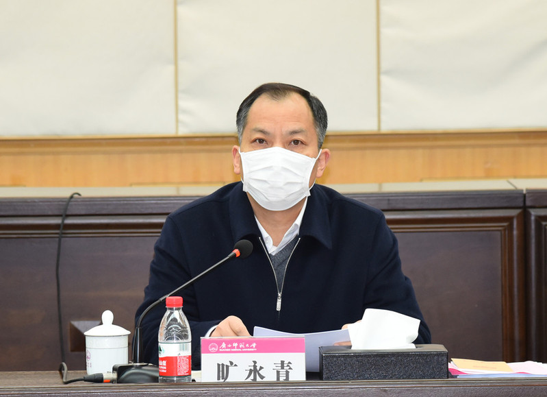 旷永青在会上总结发言。他要求,全体学工干部要认真贯彻落实学校2020年学生工作会议精神,统一思想、凝聚共识,全面加强和改进学生工作:一要聚焦新要求新情况新变化,统筹做好疫情防控和开学准备工作。各学院(部)要贯彻落实学校疫情防控部署要求,认真做到“四个严格”;二要对标对表任务目标,高质量做好就业状况布点监测工作。要准确把握当前高校毕业生就业面临的形势,深刻认识就业状况布点监测工作的重要意义,扎实推进就业状况布点监测工作落实落地;三要聚焦建设高水平大学的现实需要,精心做好校庆筹备工作。要充分认识90周年校庆的重大意义,坚定不移地落实好学校各项工作部署,要通过相关校庆活动的设计,凝练一批校庆文化成果,进一步增强文化育人的软实力,要充分利用校内外宣传媒介,积极主动做好校庆宣传工作,进一步增强学生的爱校荣校情怀;四要聚焦专业化职业化发展,切实加强辅导员队伍建设。要加快落实辅导员队伍的配备要求,筹备举办今年第一期新时代辅导员工作坊,规范化建设辅导员工作室,不断提升辅导员队伍科研能力;五要聚焦学风建设这一强基工程,打造书香校园升级版。强化教学过程管理,以良好教风引领学风,严格学习过程管理,创新开展专业知识技能提升活动,加强行为养成教育,形成学风建设合力;六要聚焦开学前后安全风险排查,确保校园安全稳定。要充分认识安全稳定工资的重要性,把学生的生命安全和身体健康放在首位,加强安全教育,落实好安全稳定主体责任。