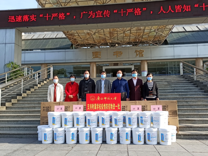 在拨付现场,孙杰远转达了学校党委、行政对附属学校的慰问,充分肯定了附属学校在疫情防控期间所做的努力和取得的阶段性成效。孙杰远表示,附属学校是广西师范大学的重要组成部分,学校高度重视附属学校的疫情防控和开学谋划工作。为缓解附属学校防疫物资紧缺的压力,继续支持附属学校第二批开学各项准备工作,学校在当前防疫物资依旧较为紧张的情况下,专门向附属学校拨付口罩30000个、消毒液800公斤、洗手液一批,用于支持附属学校复学防疫工作,进一步保障各校师生的健康安全。
