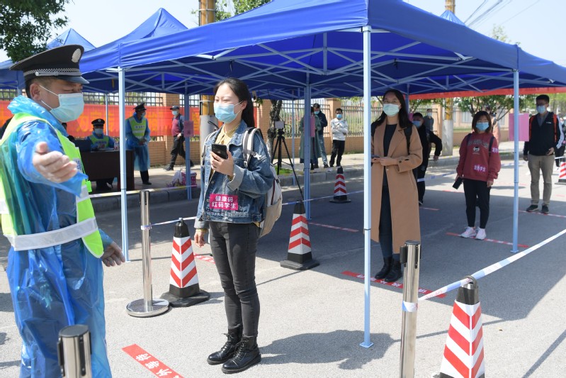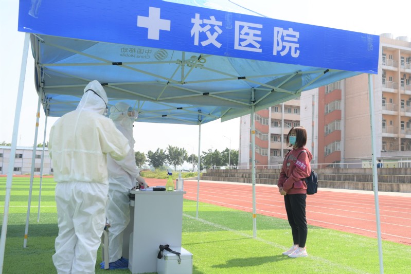 在雁山校区东大门进行的学生开学返校报到的场景演练中,设立了东大门车辆临时停靠点、入校通道、测温点、身份核验点和临时观察区及摆渡车辆区,由工作人员引导“学生家长”进行车辆停靠,并引导“学生”分别演练了排队入校、体温检测、健康码核验以及返校资格凭条审核等环节,重点模拟演练了发热学生的应急处置工作流程。随后,学生宿舍以及课堂教学现场均按预定流程进行了学生发热应急处置模拟演练。整个演练过程紧张有序,严肃认真,参与人员分工明确,各个环节配合密切,取得了预期的效果。