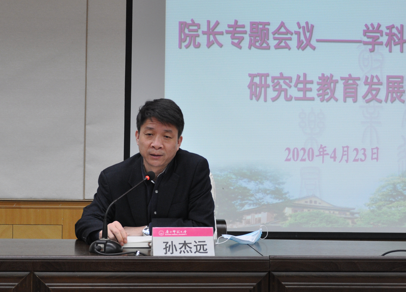 4月23日下午,我校在育才校区图书馆一楼报告厅召开2020年第三次院长专题会,研究讨论学科建设与研究生教育发展工作。校长贺祖斌、副校长孙杰远、黄文韬出席会议,人事处、社科处、科技处、财务处、国际处等职能部门负责人、研究生院、党委研究生工作部、各研究生招生单位院长及分管研究生工作的副院长等50余人参加了本次会议。会议由研究生院院长主持。