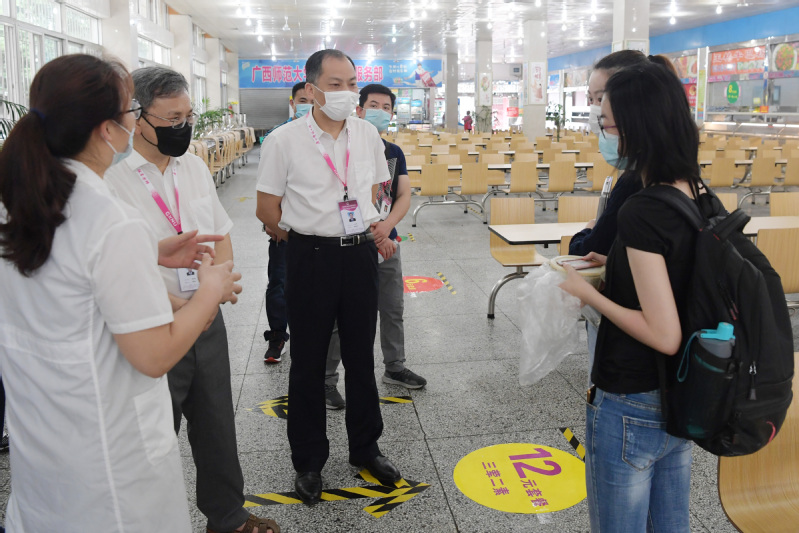 校领导旷永青、赵铁、黄文韬、苏桂发、孙杰远、莫坷、林春逸、李英利,校党委常委林国庆、黄海波以及学校疫情防控工作领导小组成员分赴王城校区、育才校区、雁山校区实地检查了校门报到点、学生公寓组团、校医院、校友惠超市以及学生食堂等重点场所,听取了第二批学生返校报到各项工作汇报,并对相关工作流程、防控措施和风险防控点提出了指导意见。