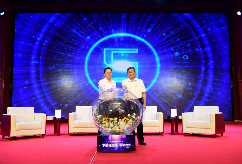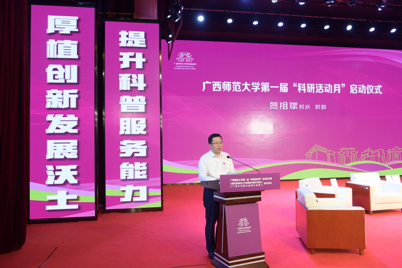 校党委书记邓军与校长贺祖斌教授共同按下启动球,标志广西师范大学第一届“科研活动月”正式启动。