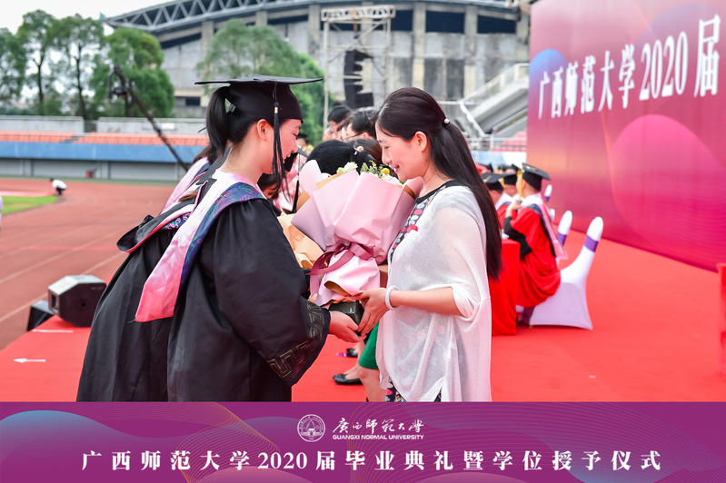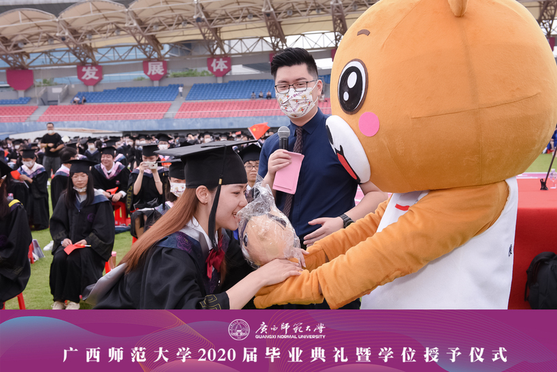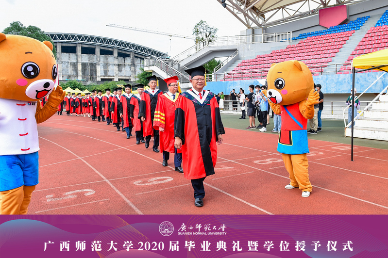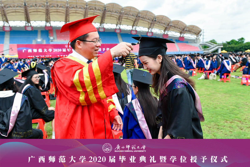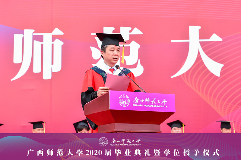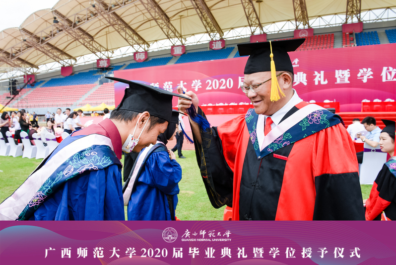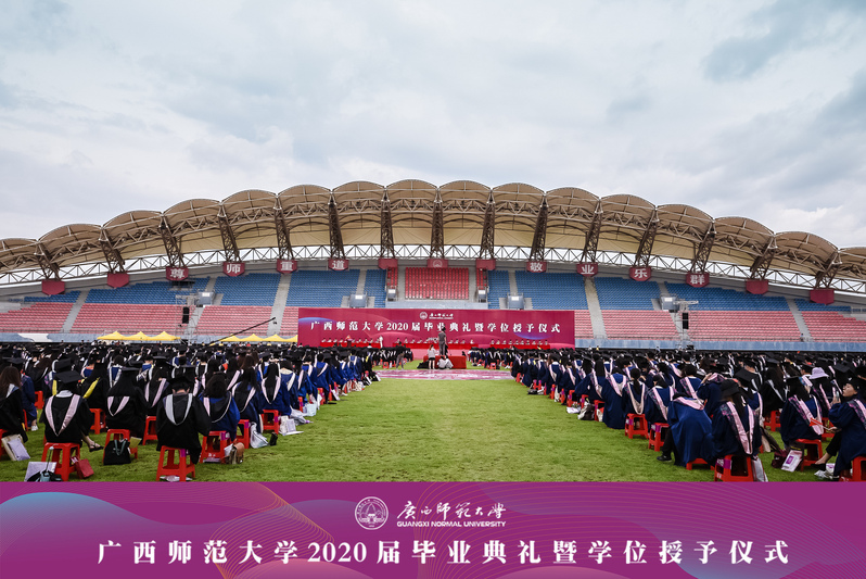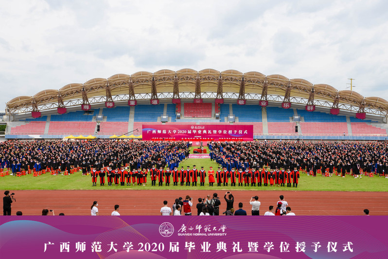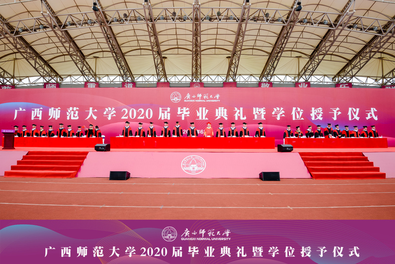 历史上首次线上线下同步进行的毕业典礼,注定是特别且难忘的。由于疫情影响,广西师范大学历史上第一次“线上线下”毕业典礼于6月23日上午在雁山校区体育馆举行,典礼全程进行网络直播,典礼现场有3500多名毕业生以及逾6.9万未能到场的毕业生、毕业生亲友、校友等社会各界嘉宾在线观礼。校党委书记邓军、校长贺祖斌等全体校领导在主会场为毕业生代表拨穗,赠送毕业生纪念品。校党委副书记旷永青主持仪式。