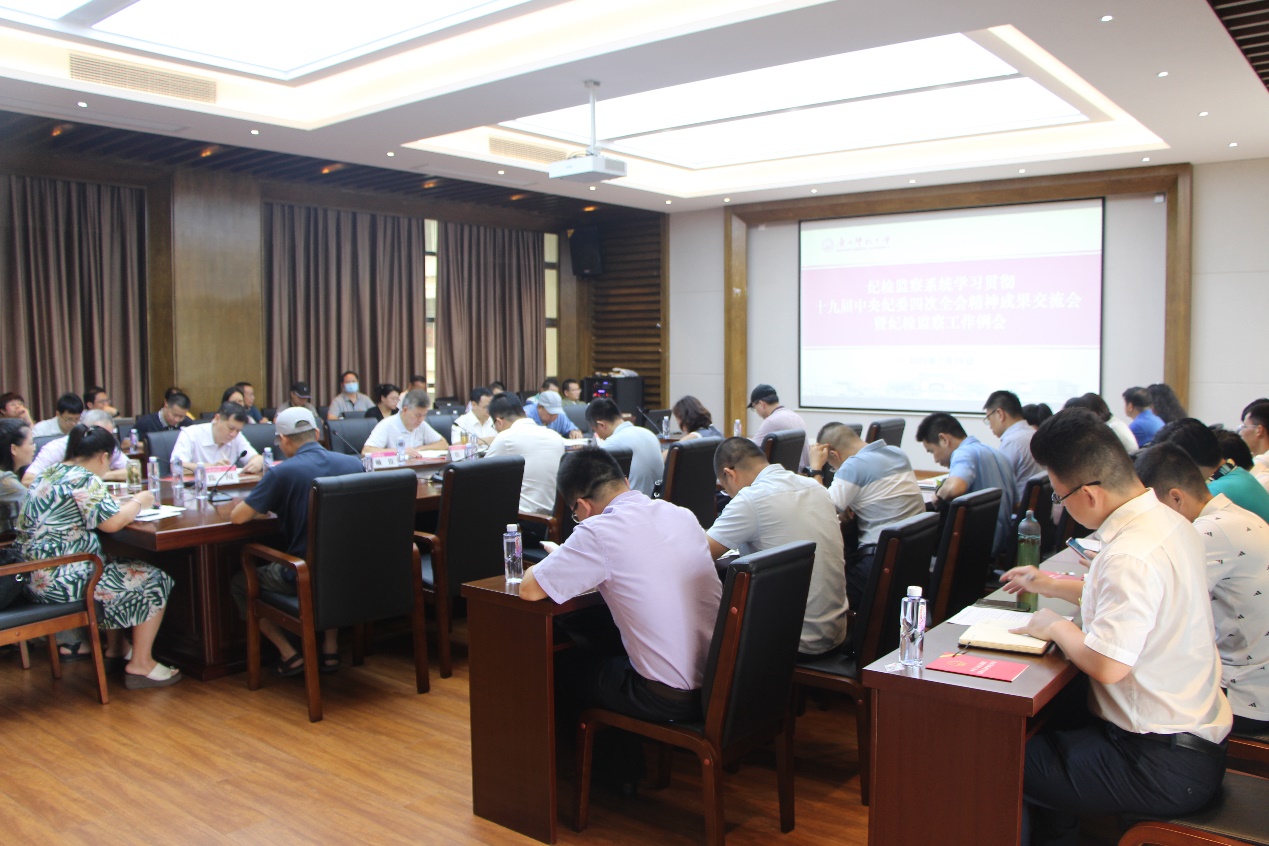 7月18日上午,我校纪检监察系统学习贯彻十九届中央纪委四次全会精神交流会暨第5次纪检监察工作例会在雁山校区第四会议室召开。各二级单位纪委书记、党总支纪检委员,机关党委各支部纪检委员以及纪委办、监察处、巡察办全体人员,共60余人参加本次会议。校党委常委、纪委书记莫坷出席会议并作讲话,校纪委办负责人主持会议。