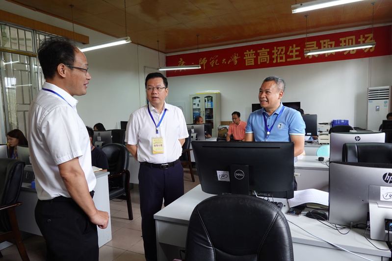 8月17日上午,校长贺祖斌来到我校本科招生录取现场听取工作汇报,看望暑假期间仍然坚守岗位的招生录取工作人员,实地指导工作。