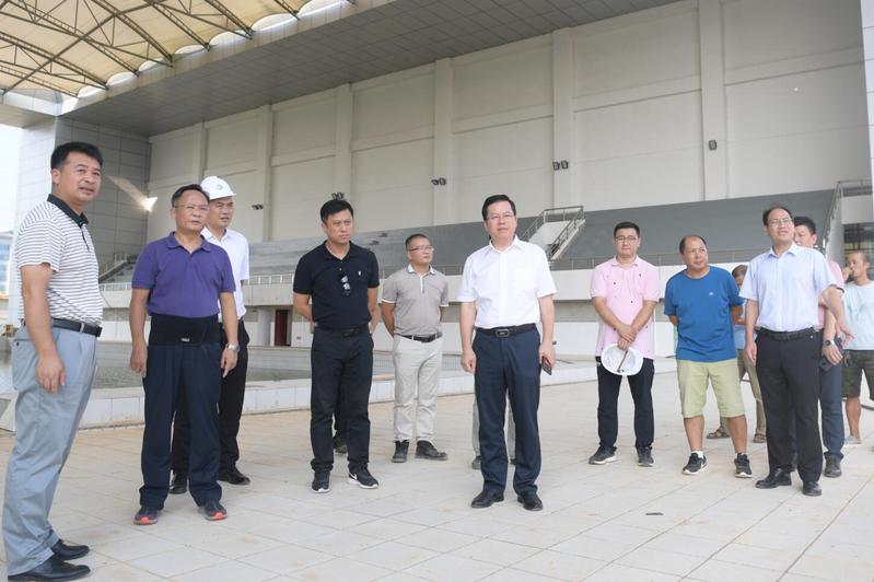贺祖斌在检查游泳馆建设工地