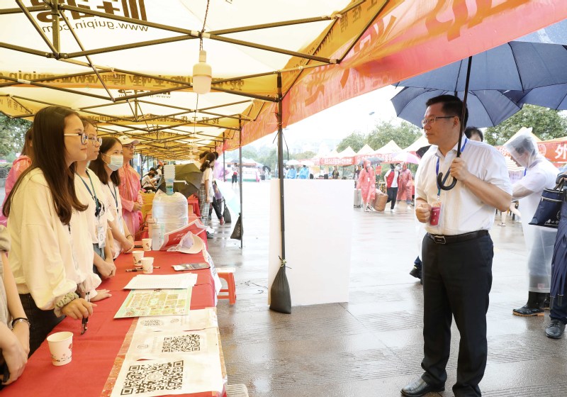 贺祖斌校长一行先后来到雁山校区和育才校区的新生报到现场和学生宿舍区进行检查指导。在雁山校区的北一门报到现场,贺祖斌详细询问了新生报到情况和迎新流程,并与报到同学们及新生家长进行热情交流。