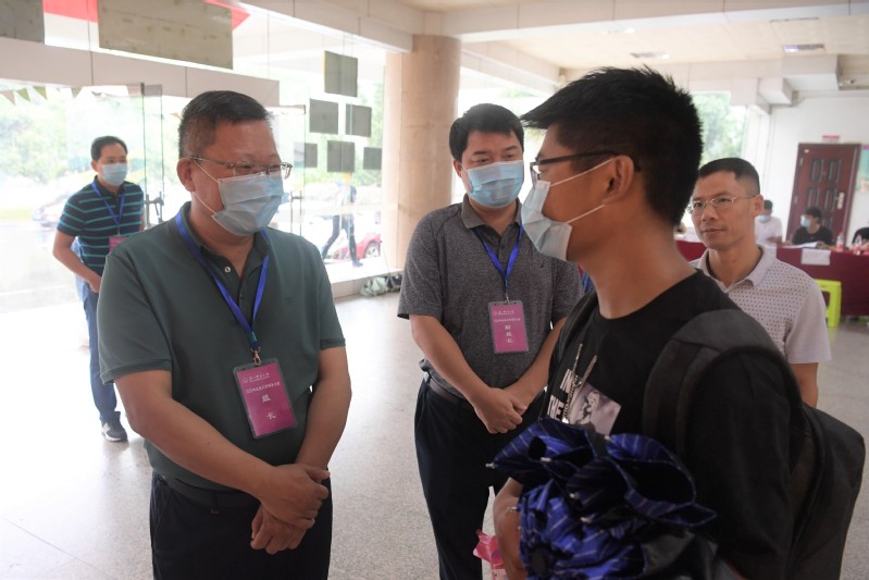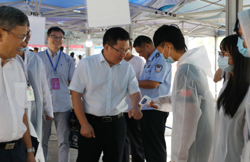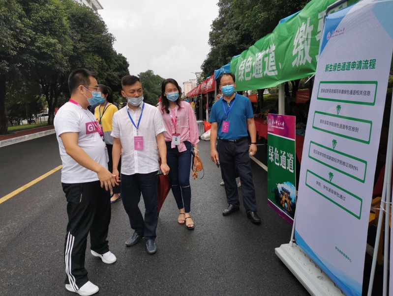 邓军书记率队前往育才校区、雁山校区的新生报到点、学生公寓及部分学院迎新点开展实地检查指导。在入校报到点,邓军检查了新生入校查验环节、了解了疫情防控要求下的各项报到举措,他为迎新工作人员及志愿者的辛勤付出表示感谢,并叮嘱大家在细心用心地做好迎新工作的同时,注重个人休息与防控。