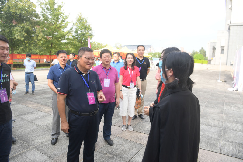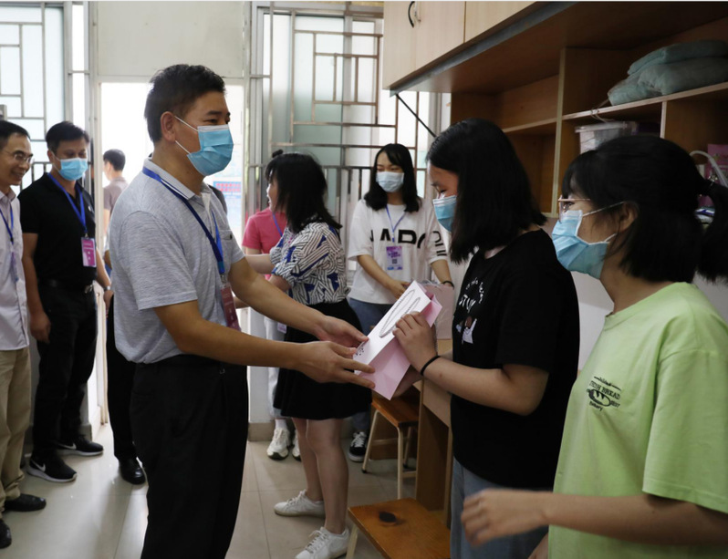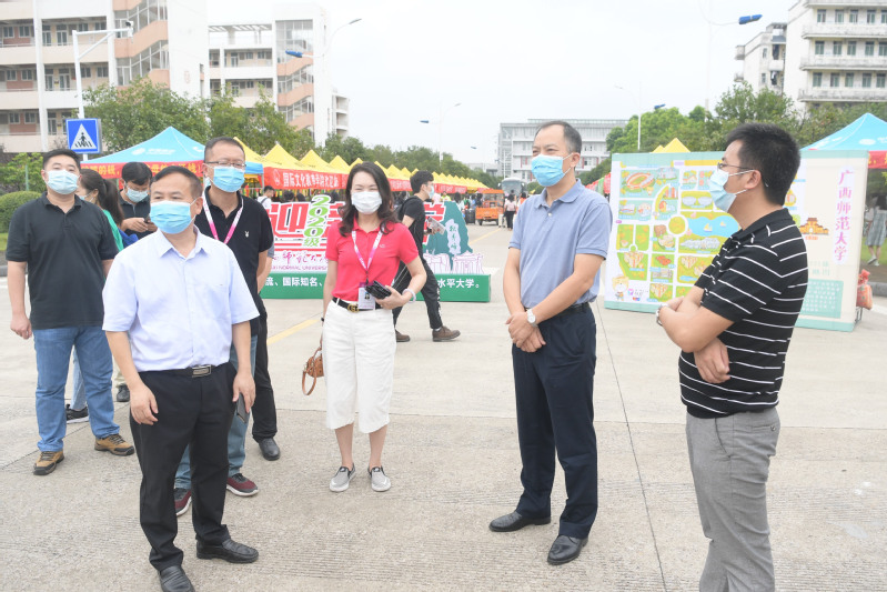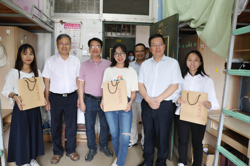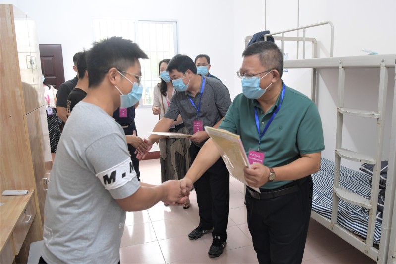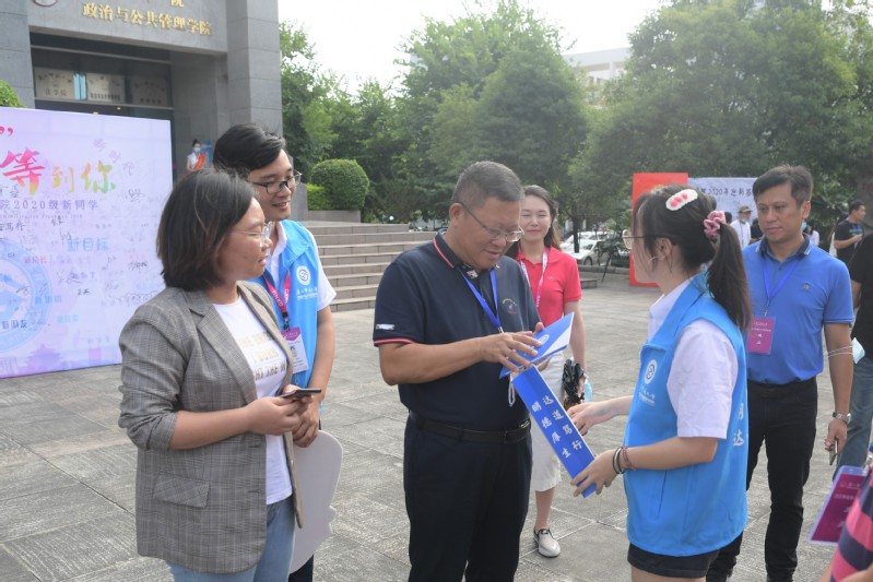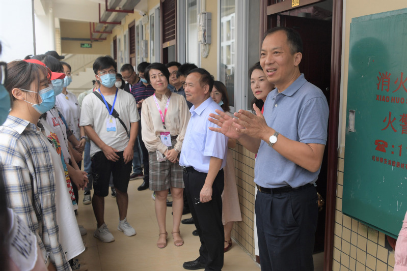 在雁山校区,邓军书记一行检查了部分学院迎新点,了解学院迎新接待流程与新生报到信息,详细询问了相关新生保障服务工作落实情况并体验了学院特色迎新生仪式,邓军对各学院精心准备的迎新活动及相关服务环节给与了充分肯定。邓军还深入学生宿舍与新生亲切交谈,他给这批经历了战“疫”期间备战高考及云端课堂挑战的同学们“点赞”,亲切询问了同学们初入广西师范大学感受,鼓励同学们好好学习,尽快适应大学生活,顺利开启新征途。