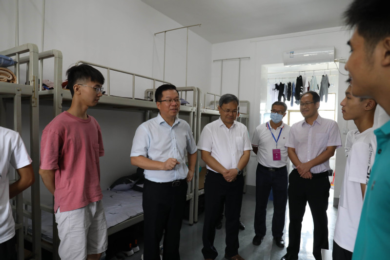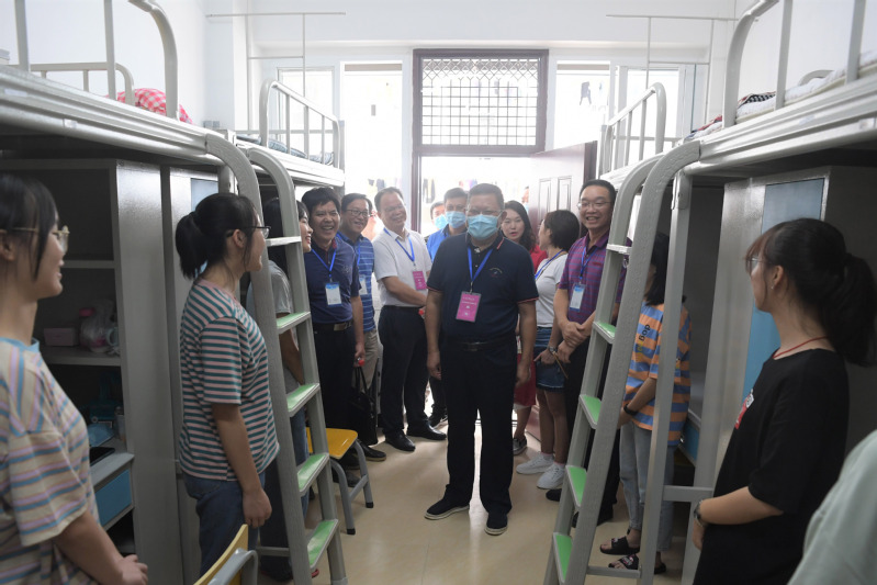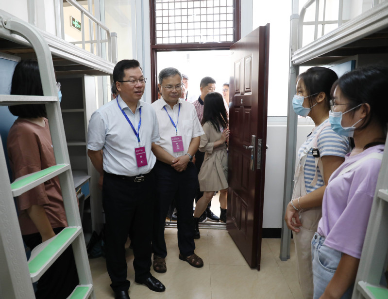 在两校区的学生宿舍区域,贺祖斌一行查看了学生宿舍的生活环境和设施,他在实地检查中要求相关单位切实做好2020级新生入学工作和新宿舍区建设工作,尤其要高度重视学生宿舍的安全问题,定期开展安全检查,妥善处理相关问题,及时消除各类隐患。贺祖斌还深入新生宿舍区看望已经入住的新同学,他与在场的同学们分享自己学生时代的宿舍生活经历,并勉励同学们珍惜未来的大学生活和宿舍生活,祝福大家新学期一切顺利。