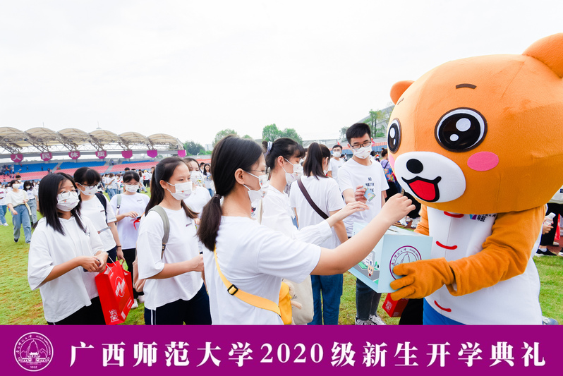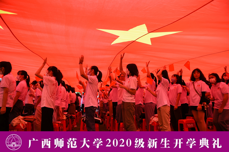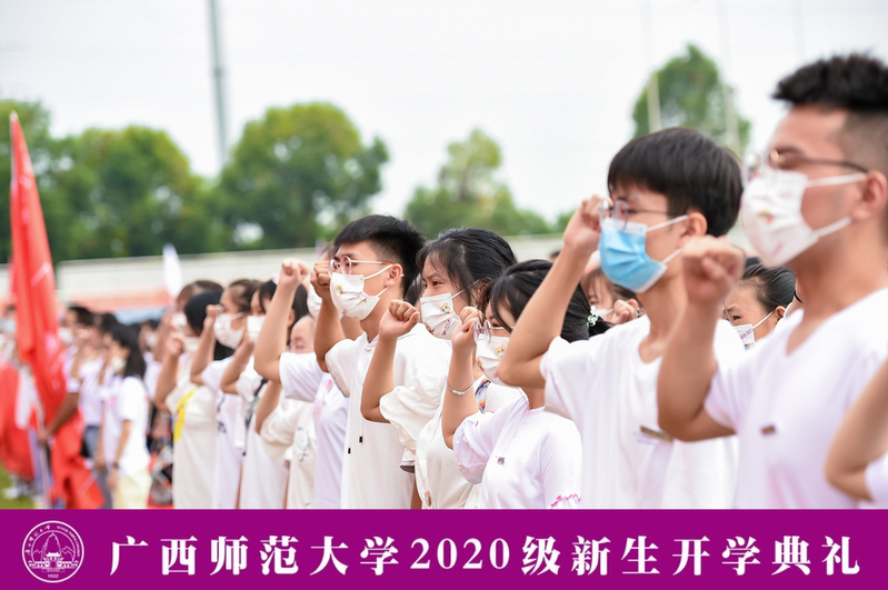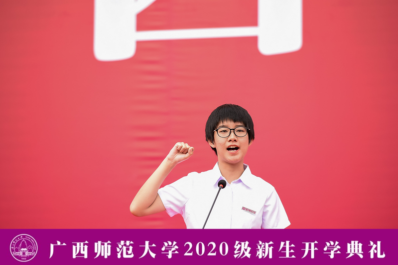 典礼上,全体新生郑重地佩戴校徽,标志着他们从此成为广西师大的一员。新生代表肖婧彤带领现场新生入学宣誓,全体新生郑重立下“爱国守法,诚信友善。志存高远,勤学笃行。尊师重道,敬业乐群。学为人师,行为世范。德才兼备,知行合一。求真创新,砥砺奋进。”的誓言。