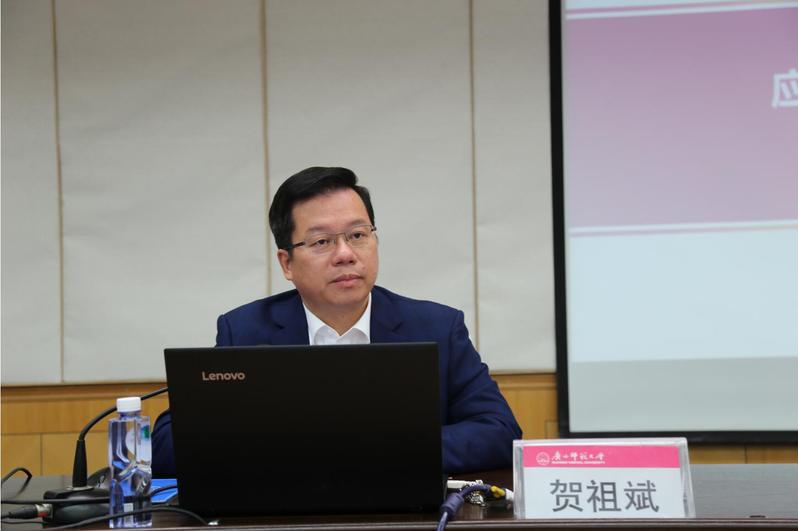 贺祖斌校长为培训班做题为《应用型高校转型与发展》的专题报告。贺祖斌详细介绍了我校办学历史、发展成就以及深化综合改革和推进“双一流”建设的经验,将我校推进治理体系和治理能力现代化建设,着力完善现代大学制度,不断深化和健全学校高质量发展“十大制度体系”的具体做法作为“大学治理实践案例”进行了分享。贺祖斌还结合习近平总书记关于教育的重要论述和全国教育大会精神,通过对《关于引导部分地方普通本科高校向应用型转变的指导意见》、“新时代高教40条”、《中国教育现代化2035》、《深化新时代教育评价改革总体方案》等上级文件精神的深度解读,以精辟的理论阐释、详实的数据分析和具有前瞻性的发展展望对应用型高校转型发展路径、应用型高校建设要素、应用型人才培养模式等内容进行了透彻讲解。