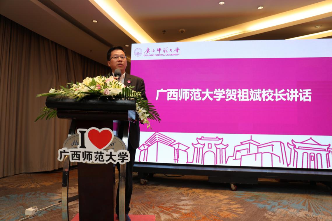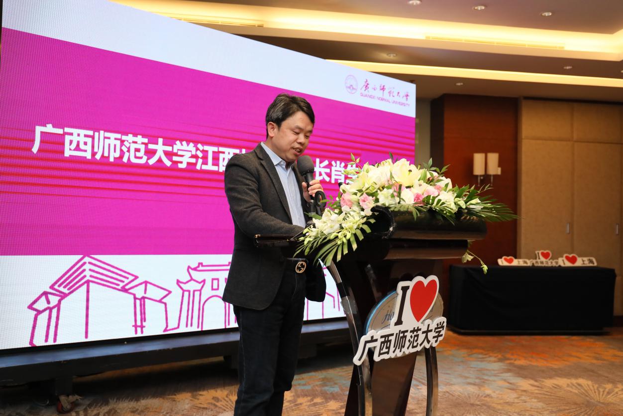 贺祖斌在大会上讲话。他首先代表学校对上海校友会的成立表示热烈的祝贺,对长期以来心系母校、关心和支持母校发展的校友们表示衷心的感谢,并介绍了母校建校88年以来的发展情况、取得的成绩。他指出,校友是学校建设发展的宝贵资源,学校非常重视校友工作,广西师范大学校友会自去年10月成立以来,相继在广西区内14个地级市、2所高校、1家国企成立了17个校友联络处,在区外相继成立了海南校友会、法学院北京校友分会、广东MBA校友会、江西校友会,搭建了新的校友组织机构。他希望,上海校友会成立后,充分发挥情感纽带作用,凝聚校友力量,畅叙校友情谊;充分发挥自己的优势,为当地经济建设和社会发展作出积极的、作为师大人的贡献。2022年,母校即将迎来90华诞,他希望校友们继续关注母校发展,两年后相约母校、齐叙友情、共商发展。