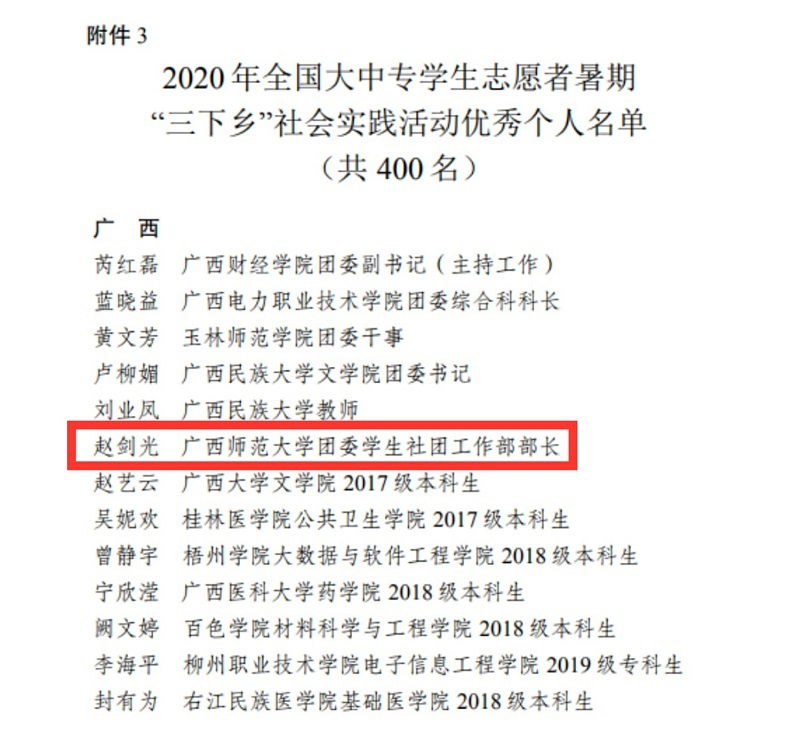 近日,团中央青年发展部对在2020年全国大中专学生志愿者暑期“三下乡”社会实践活动中表现突出的集体和个人进行通报。我校荣获“优秀单位”称号,赵剑光老师荣获“优秀个人”称号。