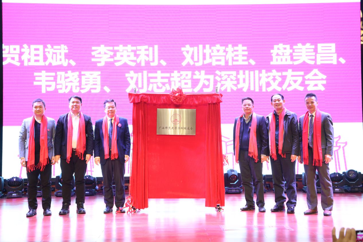 贺祖斌(左三)、李英利(左二)、刘志超(左一)、盘美昌(右三)、刘培桂(右二)、韦骁勇(右一)共同为深圳校友会揭牌