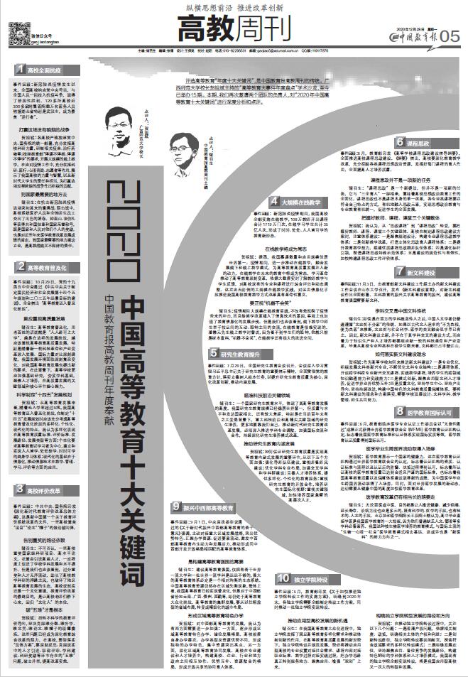 12月28日,《中国教育报·高教周刊》发布《中国教育报高教周刊年度奉献·2020中国高等教育十大关键词》。今年的中国高等教育十大关键词由我校校长贺祖斌教授和中国教育报高教周刊主编储召生担任点评人,共遴选出“高校全面抗疫”“高等教育普及化”“高校评价改革”“大规模在线教学”“研究生教育提升”“课程思政”“新文科建设”“医学教育国际认可”“振兴中西部高等教育”“独立学院转设”等十大关键词。