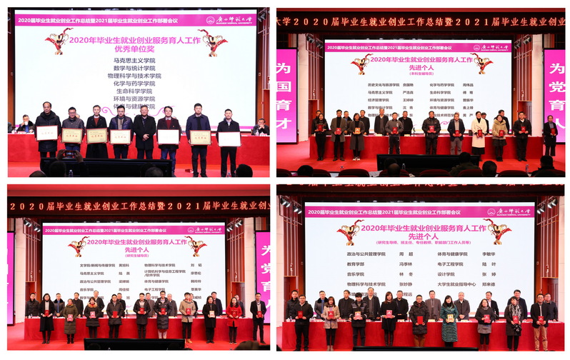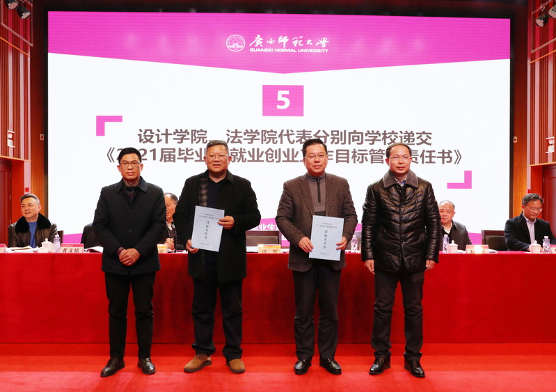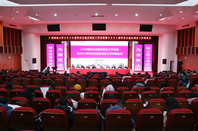 在疫情防控常态化工作下,为进一步打好打赢2021年“保就业、稳就业”攻坚战,1月12日,我校在雁山校区音乐楼三楼综合厅召开2020届毕业生就业创业工作总结暨2021届毕业生就业创业工作部署会议,会议研究部署2021届毕业生就业创业工作。校党委书记邓军出席会议并讲话,校党委副书记、校长贺祖斌主持会议。校领导旷永青、赵铁、黄文韬、林春逸、蔡 韧、李英利,校党委常委林国庆、黄海波出席会议。