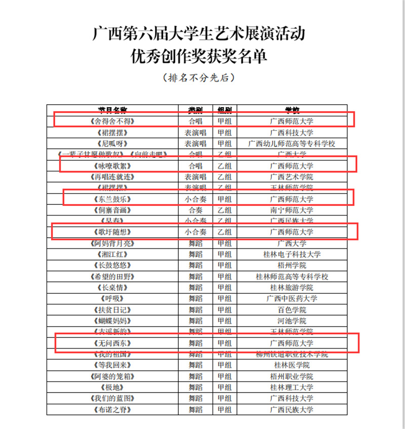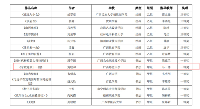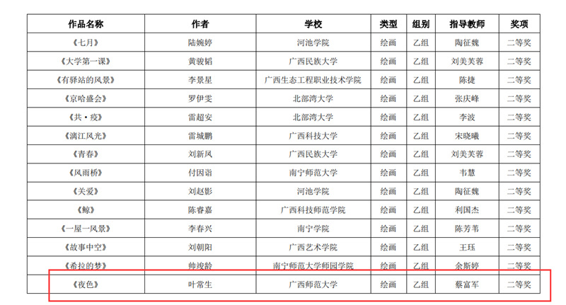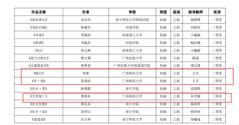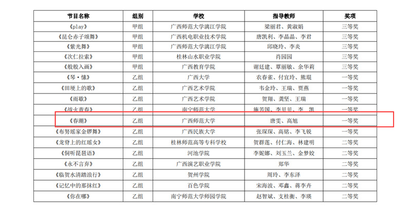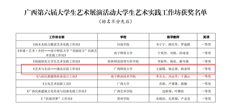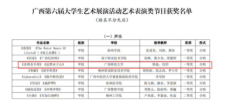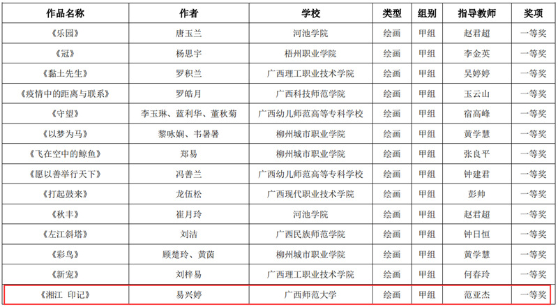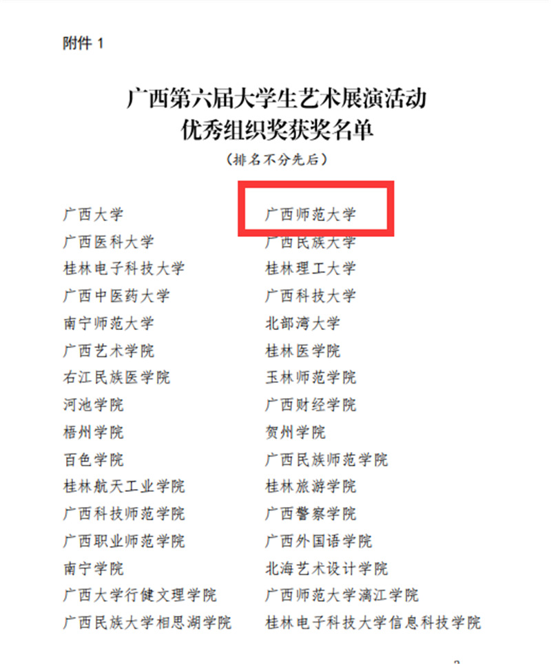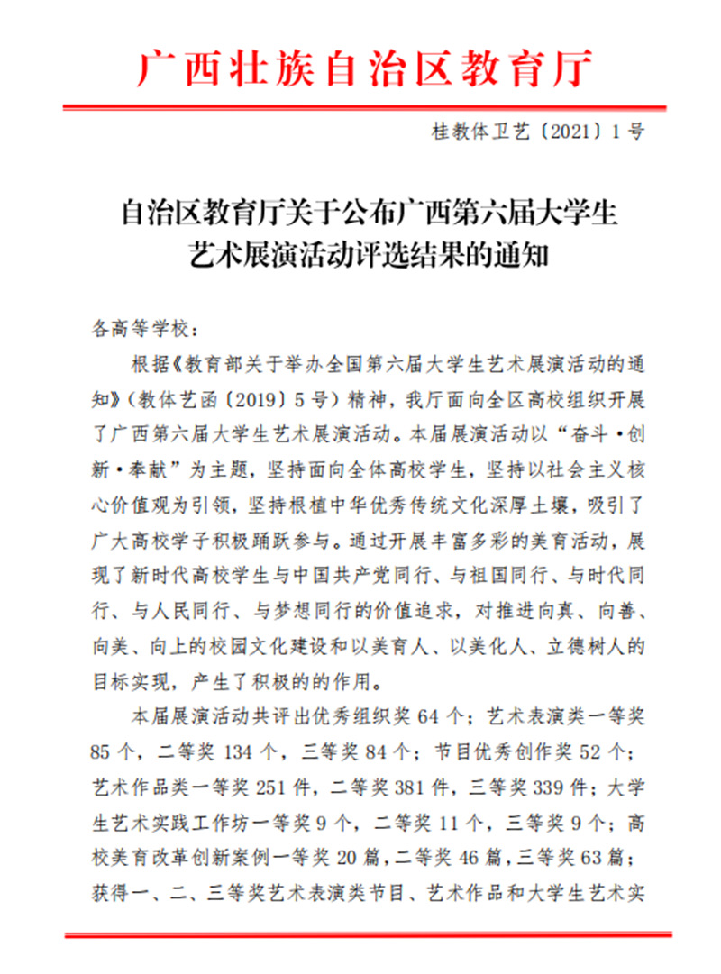 近日,自治区教育厅发文公布广西第六届大学生艺术展演活动评选结果,我校在本次展演中荣获优秀组织奖,选送的师生作品共获一等奖23项、二等奖9项、三等奖3项,优秀创作奖7项。其中艺术表演类作品获一等奖7项、二等奖1项、三等奖1项;艺术作品获一等奖11项、二等奖8项、三等奖1项;美育改革创新案例一等奖4项、三等奖1项;大学生艺术实践工作坊获一等奖1项。