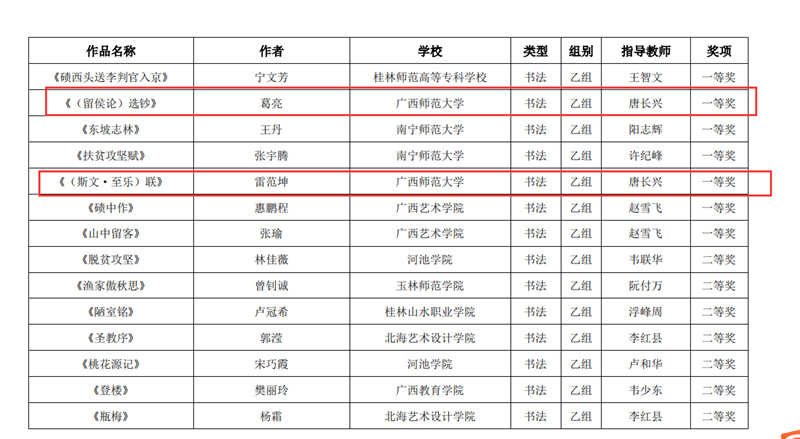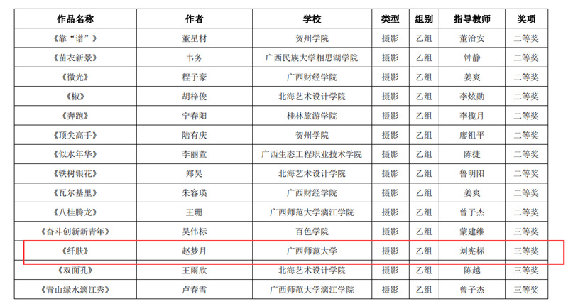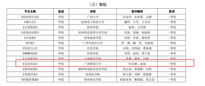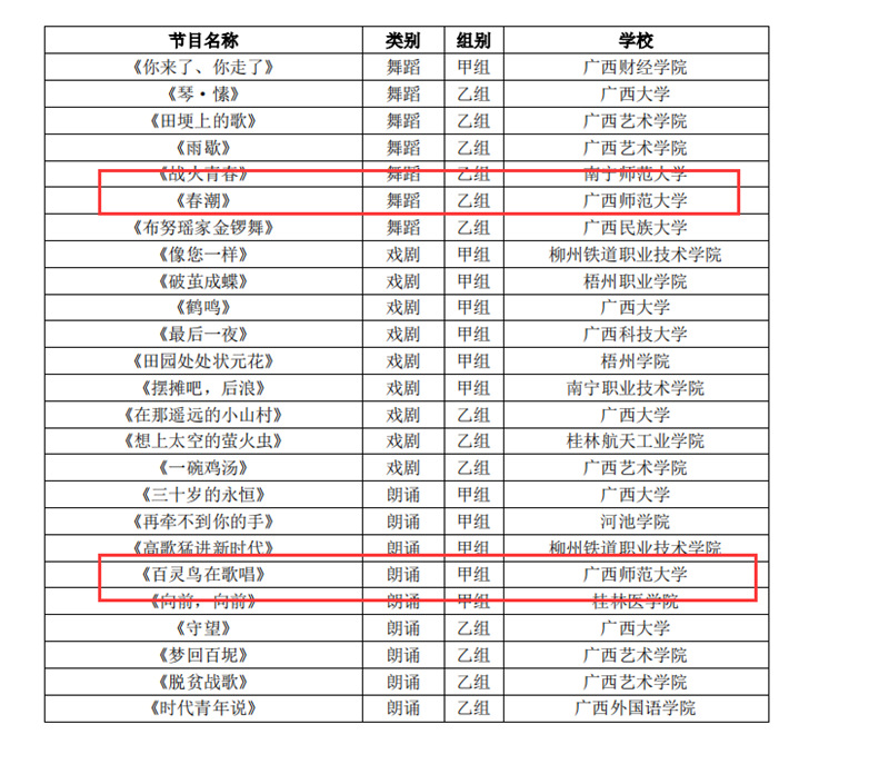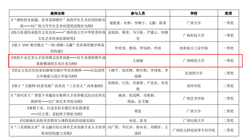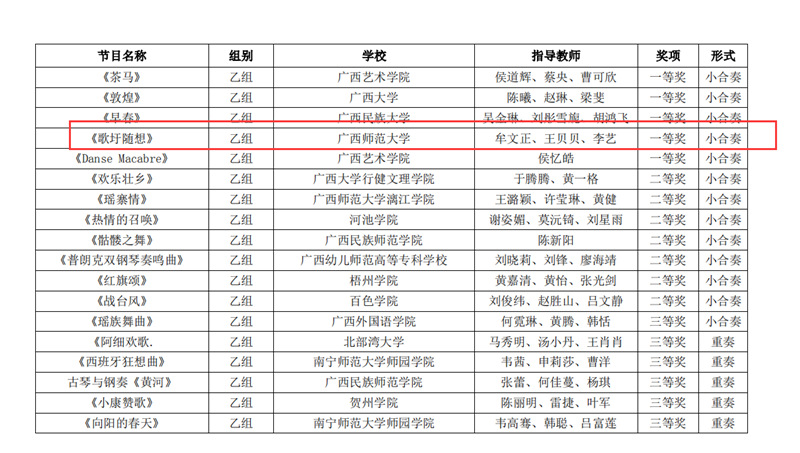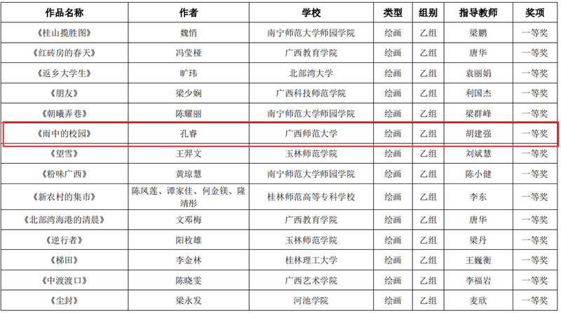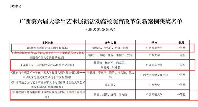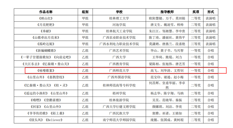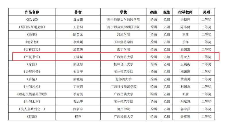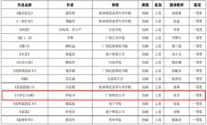近日,自治区教育厅发文公布广西第六届大学生艺术展演活动评选结果,我校在本次展演中荣获优秀组织奖,选送的师生作品共获一等奖23项、二等奖9项、三等奖3项,优秀创作奖7项。其中艺术表演类作品获一等奖7项、二等奖1项、三等奖1项;艺术作品获一等奖11项、二等奖8项、三等奖1项;美育改革创新案例一等奖4项、三等奖1项;大学生艺术实践工作坊获一等奖1项。