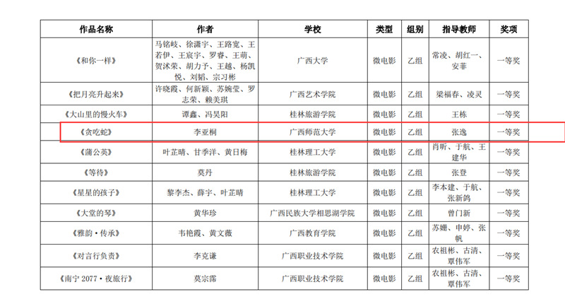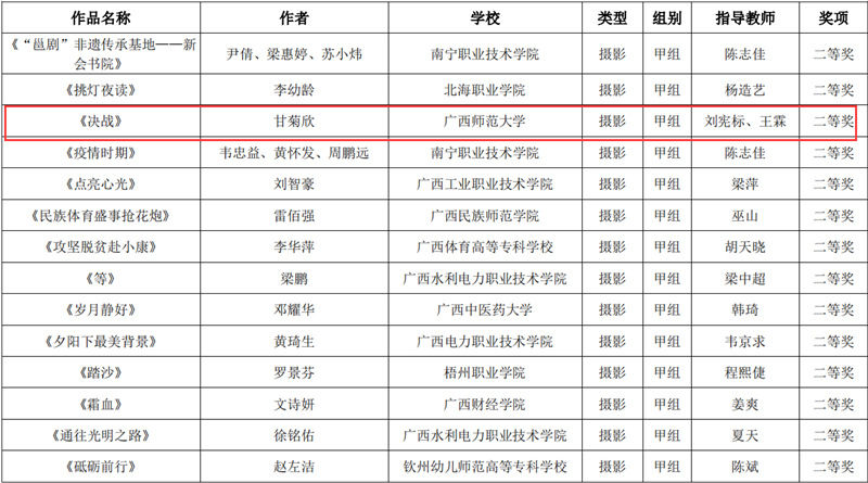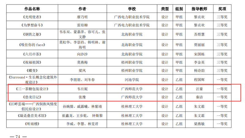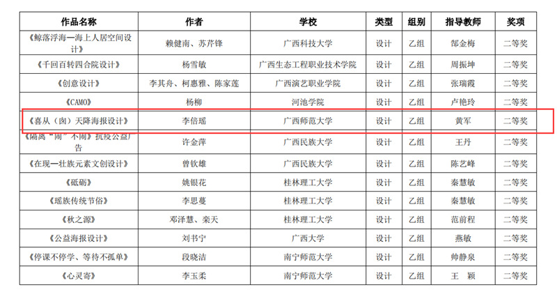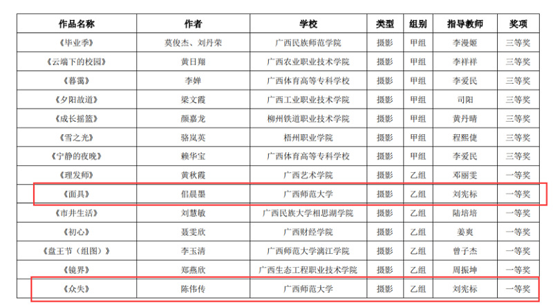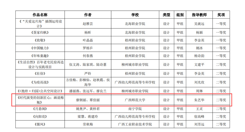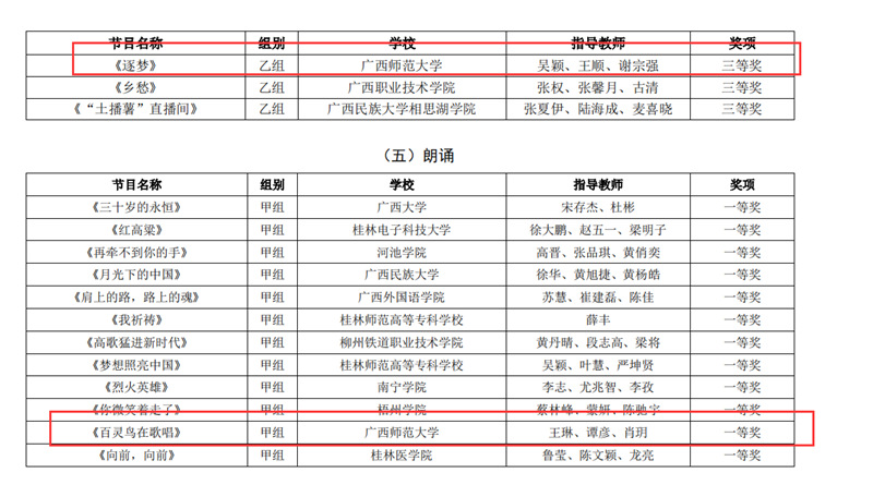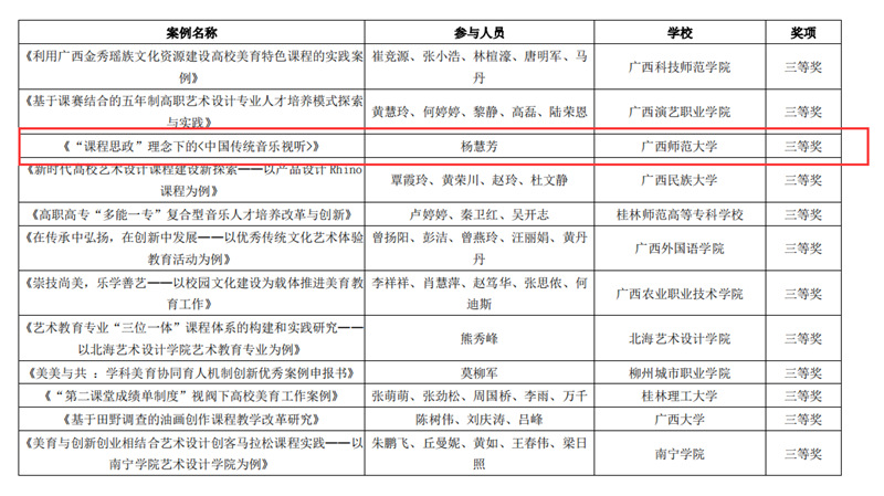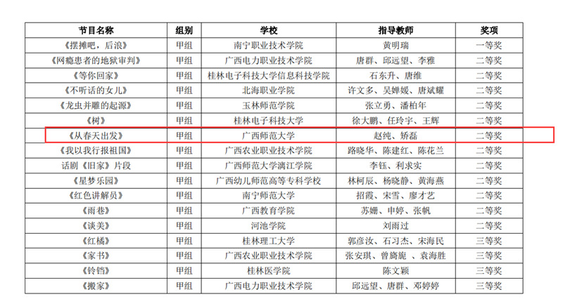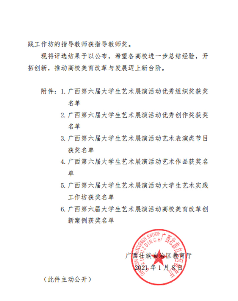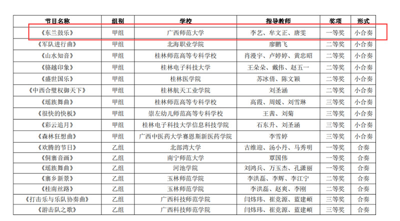 近日,自治区教育厅发文公布广西第六届大学生艺术展演活动评选结果,我校在本次展演中荣获优秀组织奖,选送的师生作品共获一等奖23项、二等奖9项、三等奖3项,优秀创作奖7项。其中艺术表演类作品获一等奖7项、二等奖1项、三等奖1项;艺术作品获一等奖11项、二等奖8项、三等奖1项;美育改革创新案例一等奖4项、三等奖1项;大学生艺术实践工作坊获一等奖1项。