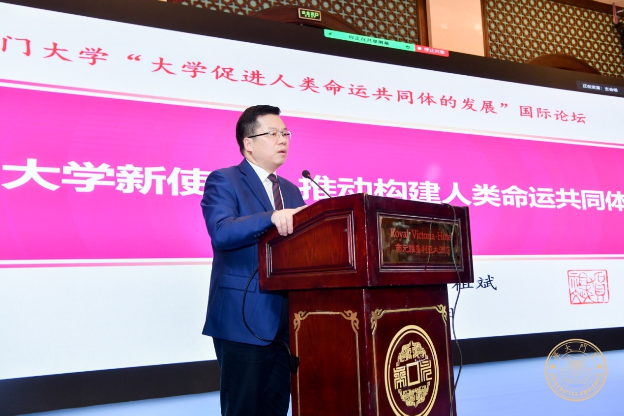 贺祖斌校长作为特邀嘉宾出席论坛并做了题为《大学新使命:推动构建人类命运共同体》的主旨报告。他从人类生存所面临的现实问题和人类生态系统的可持续发展等角度深刻论述了大学推动构建人类命运共同体的重要意义和价值。他认为,大学像其他人类组织一样,是对现在和未来都会产生影响的一种重要力量。在新的历史背景下,大学应该充分发挥其基本职能,立足教育教学与人才培养,推进科研创新与社会服务,拓宽文化交流与文明互鉴,积极承担起新的时代使命,建立起全球化发展的新生态,在推动促进人类命运共同体构建中发挥积极作用。