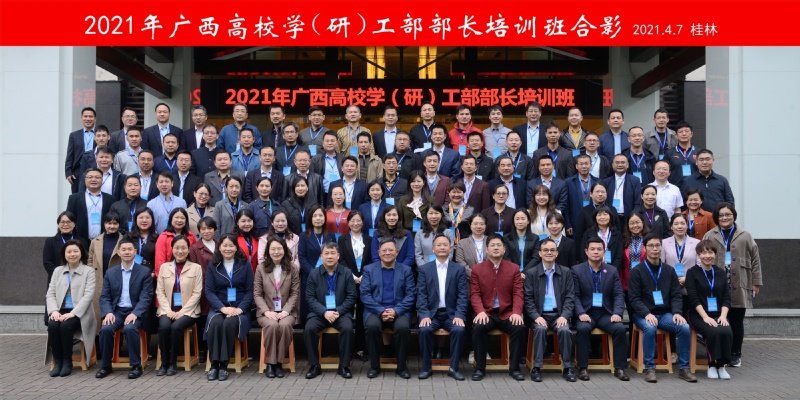 为深入学习贯彻习近平新时代中国特色社会主义思想,进一步落实全国教育大会、全国高校思想政治工作会议精神和要求,加强我区高校学(研)工部部长队伍建设,4月6日至10日,由自治区党委教育工委、教育厅主办,教育部高校思想政治工作队伍培训研修中心(广西师范大学)承办的2021年广西高校学(研)工部部长培训班在桂林顺利举行,全区82所高校的91名学(研)工部部长参加了此次培训。校党委书记邓军、校长贺祖斌先后应邀为培训班授课。副校长林春逸出席开班仪式。