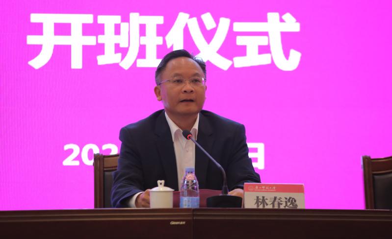 在开班仪式上,林春逸代表学校对来自全区各高校的学(研)工部部长表示热烈的欢迎,对长期以来关心帮助广西师范大学建设发展的自治区党委教育工委和各兄弟高校表示衷心感谢。林春逸向培训班学员们简要介绍了学校及高校思想政治工作队伍培训研修中心(广西师范大学)的基本情况。他指出,中国共产党是依靠学习才走向未来的政党,也是依靠优良的马克思主义学风取得学习成效、实效、时效的党,希望全体学员们要突出政治导向,迅速转变角色,树立良好学风;要突出问题导向,加强研讨交流,实现共同提高;突出能力导向,在思想政治工作能力提升上有所收获。