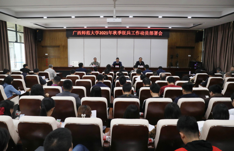 4月25日下午,我校在雁山校区起文楼第五会议室召开2021年秋季征兵工作动员部署会,桂林市秀峰区人民武装部部长杨福彪上校应邀参加会议。校党委书记邓军出席会议并讲话,校党委副书记旷永青主持会议。学校征兵工作领导小组全体成员、各学院(部)书记和分管学生工作的党委副书记、全体专兼职辅导员参加会议。