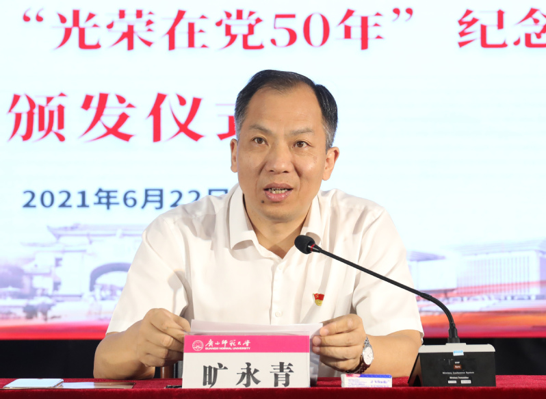 旷永青由衷地感谢老党员们用最美的青春年华,付出了毕生的心血精力,默默无闻地为党工作,他指出,这次纪念章的颁发,既是庆祝中国共产党建党100周年的一项重要活动,也是对学校老党员的一次集体致敬和鼓励鞭策,更是对学校广大党员的一次深刻的党性教育。党的百年历史所取得的伟大成就跟每一位共产党员的团结奋斗密不可分,与我校149名“光荣在党50年”的老党员的辛勤耕耘密不可分。与党同行50年的老党员,是学校改革发展的亲历者、参与者、带头者和见证者,用实际行动践行了入党誓言,诠释了初心使命,是我们党和我们学校的宝贵财富。学校的发展需要广大离退休老领导、老同志、老党员们同心同德、支持帮助。老党员们要带头关心和支持学校事业发展,持续发挥自己的政治优势、经验优势、威望优势,在参与学校教育教学改革、关心下一代工作、维护安全和谐稳定中做出更大贡献,引领更多的年轻党员在百年奋斗历程中汲取继续前进的智慧与力量,在全面建设社会主义现代化国家新征程中接续奋斗、再创辉煌,为学校奋进“十四五”再立新功!
