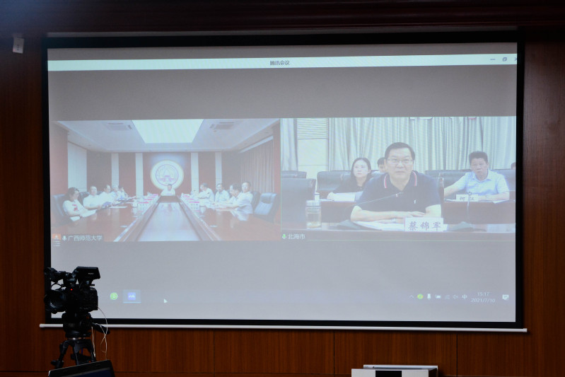 7月10日下午,我校与北海市召开深化校地合作视频座谈会,双方就联合打造校市合作共同体,创新德育实践,探索基础教育阶段教育教学与人才培养的新模式等方面进行深度交流探讨。我校党委书记邓军、北海市委书记蔡锦军出席视频座谈会并讲话,校党委副书记赵铁,校党委常委、副校长孙杰远、林春逸,校党委常委、宣传部部长汤志华,北海市委常委、常务副市长黄江,北海市政府副秘书长张实共同参加座谈会并作交流。座谈会由我校党委书记邓军主持。