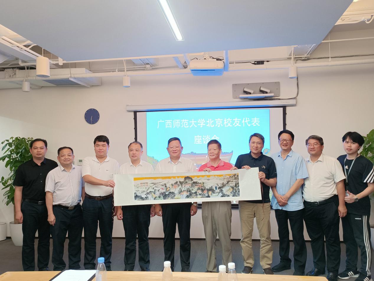 座谈会前,邓军一行参观走访了校友企业。会后,邓军代表学校向北京校友会赠送学校文创产品《独秀•育才•雁山园盛景图》。