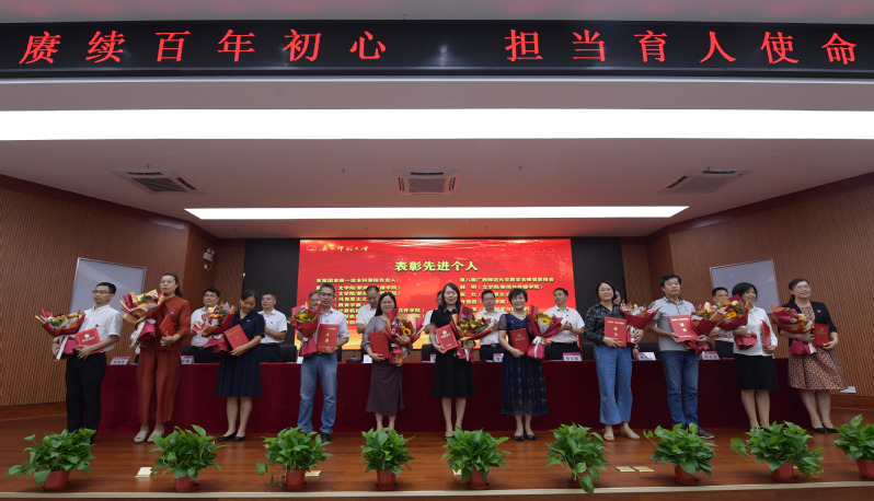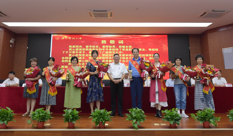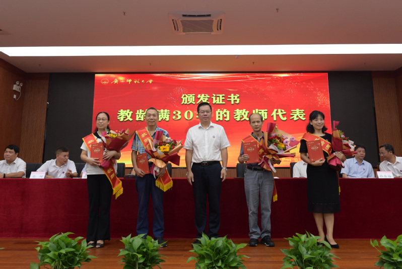 会上,邓军为2021年4—9月退休的教职工代表颁发“光荣退休纪念杯”,并向他们送上美好的祝福;贺祖斌为2021年从教满30年的教师代表颁发纪念证书;校领导、校党委常委集体为我校入选首批国家级一流本科课程负责人以及第八届广西师范大学教学名师奖获得者颁奖。