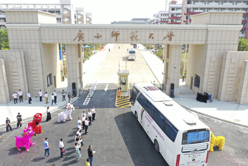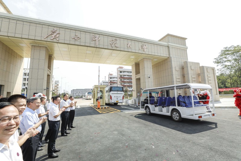 随后,一辆辆校车缓缓驶入北大门,宣告着雁山校区北大门正式启用。