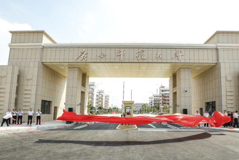 校党委书记邓军宣布雁山校区北大门正式启用。邓军、贺祖斌、旷永青、黄文韬、苏桂发、莫坷、林春逸、林国庆、黄海波共同为雁山校区北大门揭牌。