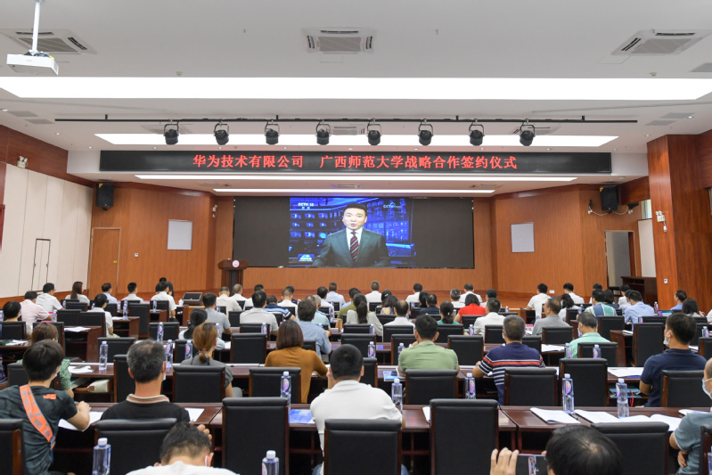 华为公司广西政企业务总经理陈进文、华为公司广西政企业务副总经理王美钧以及广西政企业务教育医疗部门相关负责人,我校网络安全与信息化领导小组成员单位和数学与统计学院、计算机科学与工程学院/软件学院、电子工程学院主要负责人,各学院(部)、各单位分管网络安全与信息化负责人,网络信息中心全体干部职工以及相关专业学生代表参加签约活动。