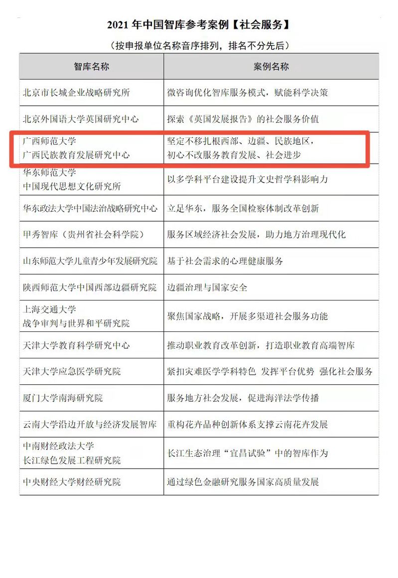 9月28日,由中国社会科学评价研究院主办的“第四届中国智库建设与评价高峰论坛”在北京举行。中国智库综合评价研究项目组发布了《中国智库AMI综合评价研究报告(2021)》,并公布了入选“2021年中国智库特色案例”“2021年中国智库参考案例”“2021年中国智库综合评价研究项目组织参与奖”的具体名单。我校广西民族教育发展研究中心申报的智库案例:“坚定不移扎根西部、边疆、民族地区,初心不改服务教育发展、社会进步”,入选2021年中国智库参考案例【社会服务】。据论坛公开的数据显示,全国454家智库共反馈了621份《中国智库综合评价研究项目2021年智库特色指标申报书》,经过多轮专家评审,共有56份申报书入选特色案例、63份申报书入选参考案例。此外,19家智库主管单位荣获“2021年中国智库综合评价研究项目组织参与奖”。