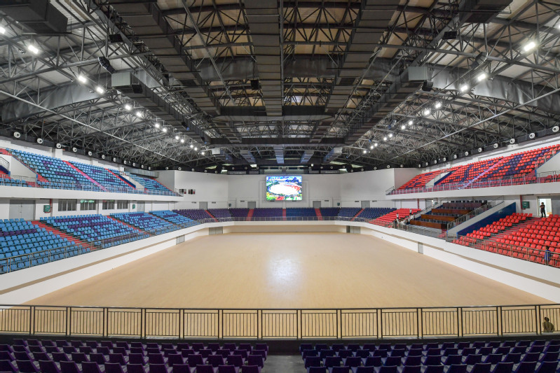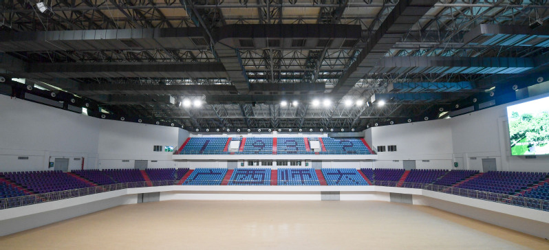 据悉,雁山校区综合体育馆总建筑面积18338平方米,占地面积9550平方米。该场馆为四层钢筋混凝土框架加屋面钢桁架结构,建筑造型充分体现现代体育建筑的动感和力度,并与校园周边环境融合,主场馆有两层固定坐席4818个,主席台坐席40个,运动木地板场地2500平方米,热身馆约1000平方米,可设活动座椅1500个,场馆可同时容纳约6500人,是西南地区较大规模的综合场馆之一。