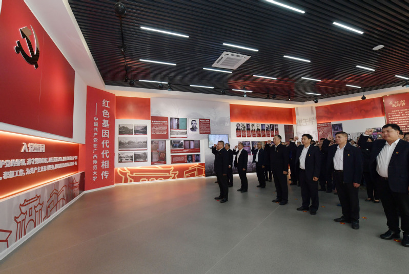 重温入党誓词结束后,邓军作了讲话,指出,建设党史展览馆、举办党史主题展览,是以习近平同志为核心的党中央做出的重大决策。学校党委在统筹安排学校庆祝建党百年系列主题宣传教育活动时,提出把建设“中国共产党简史展”作为推进我校党史学习教育的一项重要内容。简史展中的每一个历史事件、每一位革命英雄、每一种精神谱系、每一张鲜活影像,都代表着我们党走过的光辉历程、取得的重大成就,展现了我们党在团结带领中国人民进行百年奋斗的伟大历程中代代相传的红色血脉;展现了广西的革命先烈抛家纾难、顽强斗争,在八桂大地铸就的永不褪色的红色丰碑;展现了建校89年来广西师大人在党的坚强领导下始终坚守的梦想和追求、情怀和担当、牺牲和奉献,汇聚成了我们广西师大最宝贵的精神财富和最鲜亮的基因底色。
