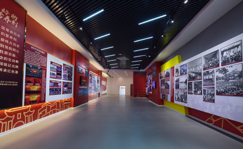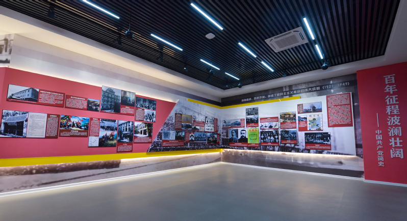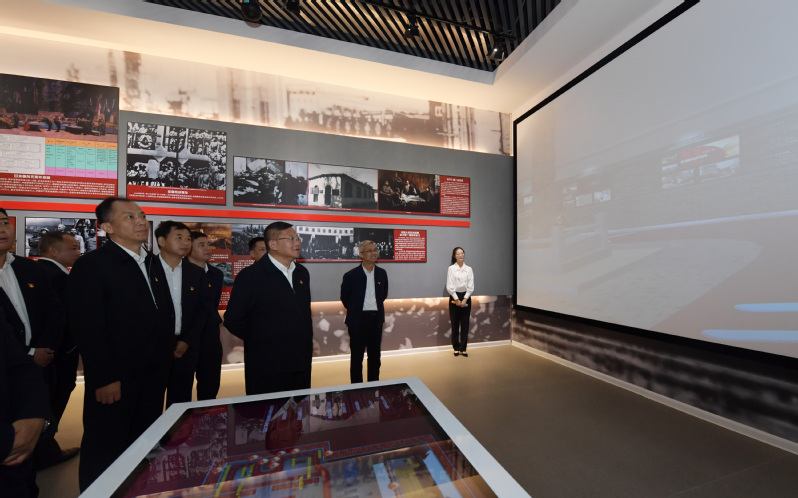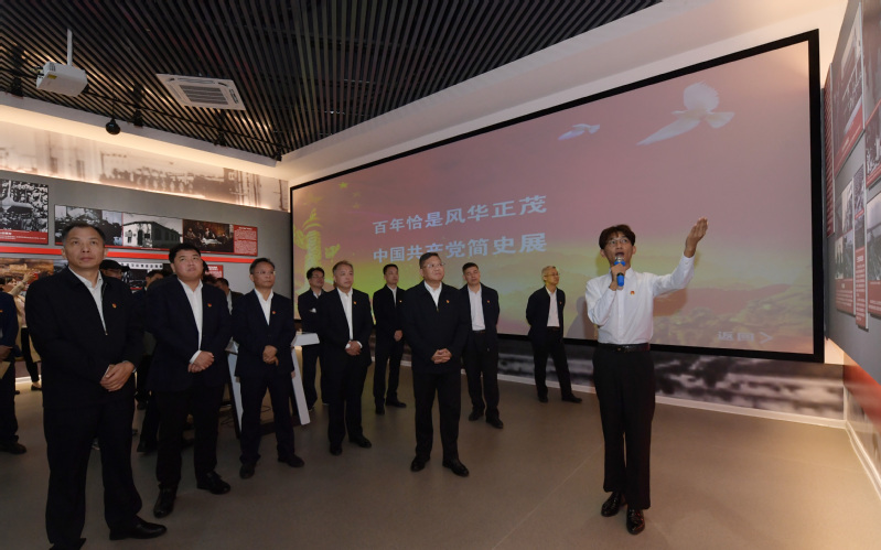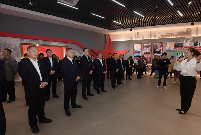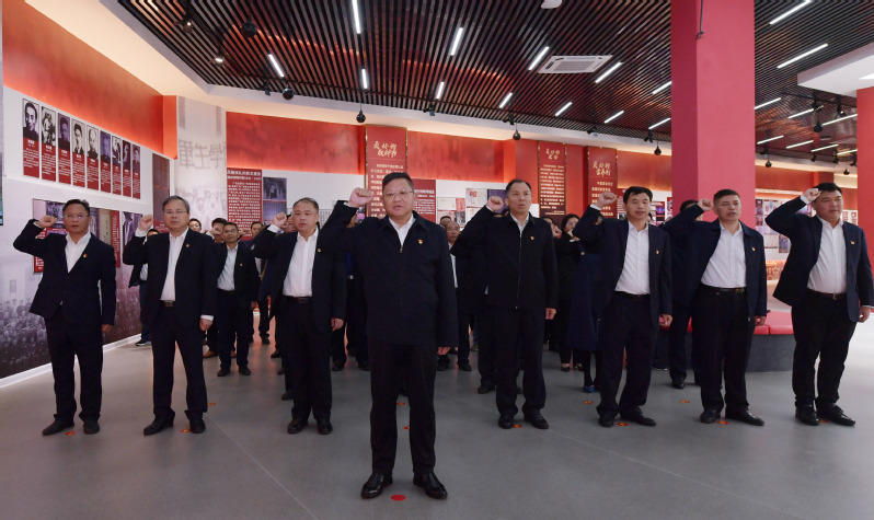 展厅正中高悬着一面巨大鲜红的中国共产党党旗,邓军率领全体党员同志举起右拳,重温入党誓词,铿锵有力的宣誓声响彻展厅。