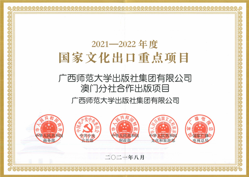 8月30日,国家商务部、宣传部、财政部、文化和旅游部以及国家广播电视总局联合下发《2021-2022年度国家文化出口重点企业、重点项目公告》,“广西师范大学出版社集团有限公司”入选国家文化出口重点企业,“广西师范大学出版社集团有限公司澳门分社合作出版项目”入选国家文化出口重点项目。