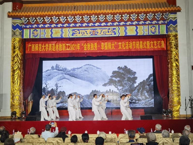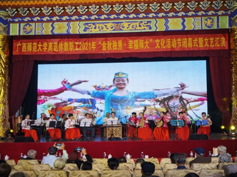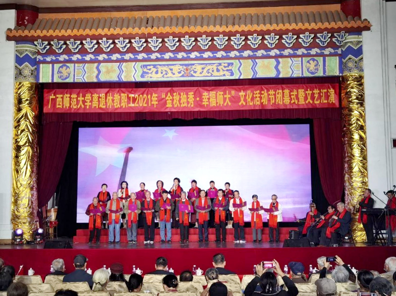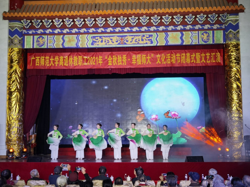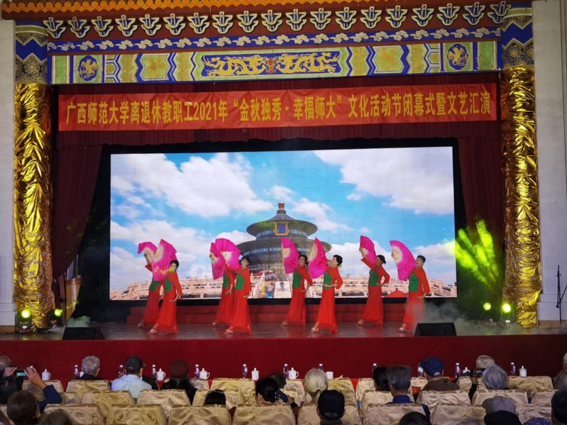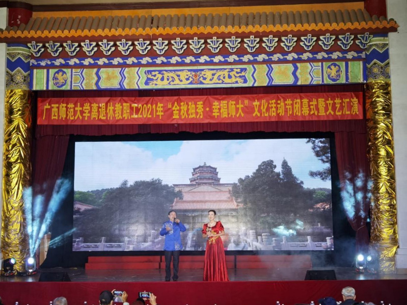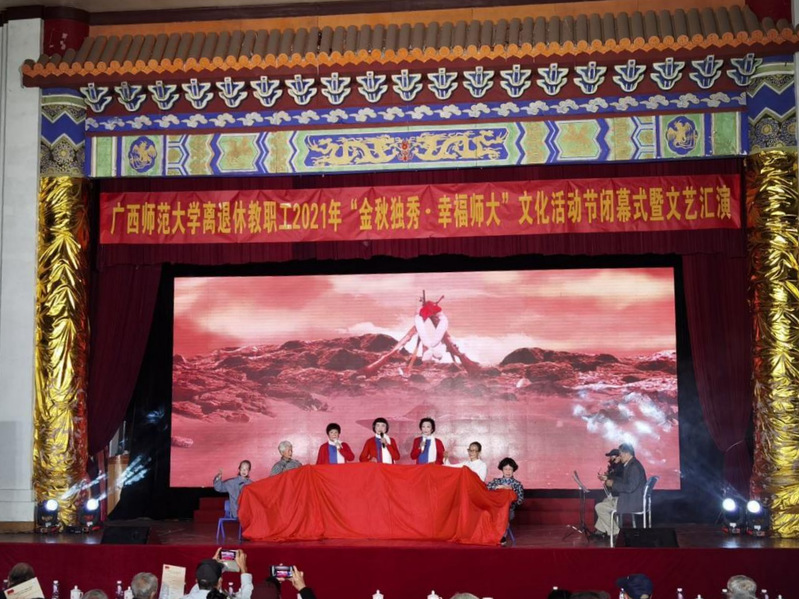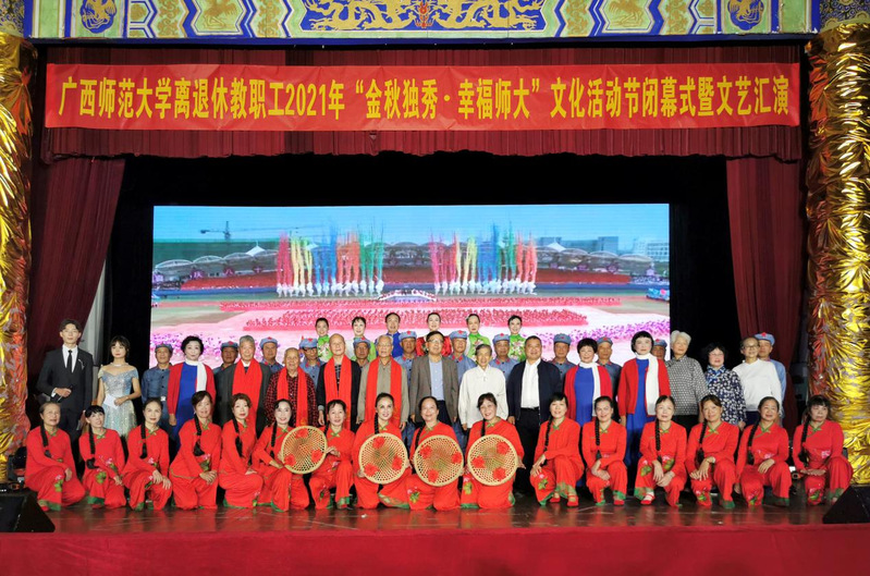 10月14日,我校2021年“金秋独秀·幸福师大”离退休教职工文化活动节闭幕式暨文艺汇演在王城校区国学堂隆重举行,校长贺祖斌、校党委副书记旷永青出席了此次活动,并与现场的老同志亲切的交谈。离退休工作处主要负责人为2021年文化活动节做了简要总结,感谢大家积极支持和参与文化节活动。随后,校领导与700多位老同志一起津津有味地欣赏了文艺汇演,为历时半个多月的文化节画上了圆满句号。